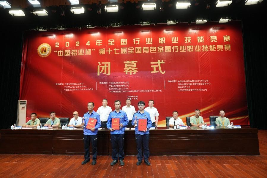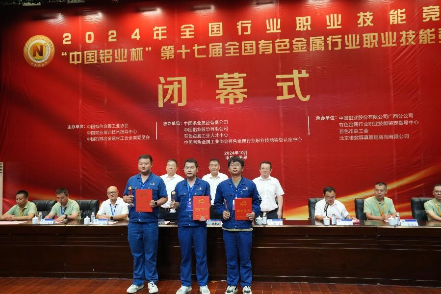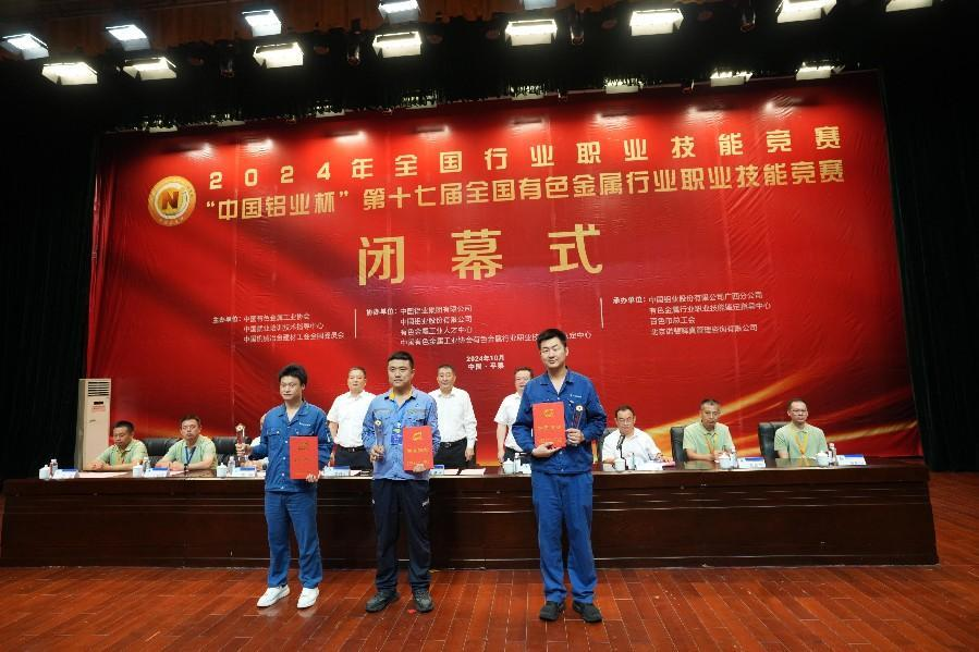 闭幕会上为参赛前15名选手以及优秀教练员、团体优胜奖和优秀组织奖单位颁发了奖牌(证书)。其中,李呈涛、许荣标、刘峰瑞、邹聪聪等12名选手分别获得铝电解工(多功能机组操作工)项目、氧化铝制取工(母液蒸发工)项目、电工(有色金属企业智能工厂方向)项目、工程测量员S(矿山测量员)项目前三名。中国铝业股份有限公司广西分公司荣获团体优胜奖第一名和优秀组织奖,江西铜业集团有限公司、包头铝业有限公司分获团体优胜奖第二、第三名。广西华昇新材料有限公司等10家企业获得团体优秀奖。陈德广等20人获评优秀教练员。据悉,“中国铝业杯”是全国有色金属行业级别最高、影响力最大、范围最广、水平最高的技能竞赛,一直引领整个行业的各类各级竞赛。(王政喆、李雪、蓝绍祯、林宏韫、吴轩熠/摄影)